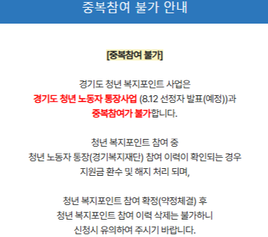 3. 청년 노동자 통장(경기복지재단), 청년 노동자 지원사업(청년연금), 청년 노동자 지원사업(중소기업청년노동자지원사업)에 해당사업에 참여 중이거나 1년 이내 (2023년 8월 1일 ~ 2024연 7월 31일) 중도해지 이력이 확인되는 경우