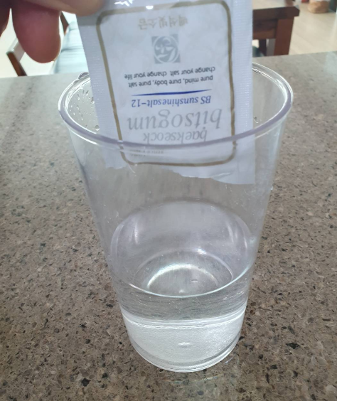 1. 증류수 또는 깨끗한 생수 한 컵 약 400ml에 백석 빛 소금 한포 약 3g을 넣어 빛 소금차 염도 0.9%로 마십니다.
