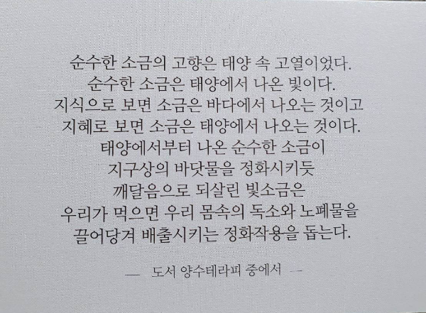 처음 바닷물을 증발시키면 염이 나오고 그 염을 깨끗한 물로 닦으면 소금이 되고, 소금은 불(고열 1000도)로 정화하면