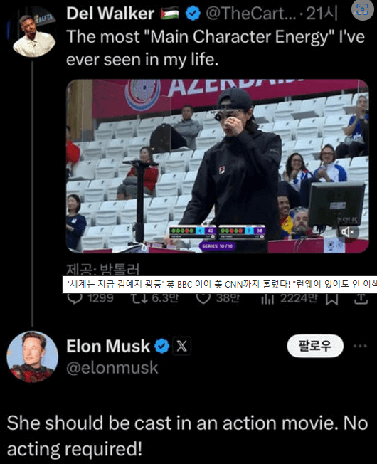 김예지 선수의 사격 포즈는 마치 여전사를 연상케 했습니다. 그녀의 결승전 영상 조회수가 2300만 회를 넘어서며 전 세계적으로 큰 인상을 남긴 것이 분명합니다. 이 영상에는 1300개 이상의 댓글이 달렸고, 테슬라 최고경영자 일론 머스크도 극찬을 아끼지 않았습니다. 그는 김예지 선수가 액션 영화에 캐스팅되어도 연기할 필요조차 없을 만큼 완벽하다고 말했습니다. 김예지 선수의 냉철한 사격 자세와 표정 변화 없이 초집중하는 모습은 파리 올림픽의 베스트 사진으로 선정될 가능성이 높다고 생각합니다.