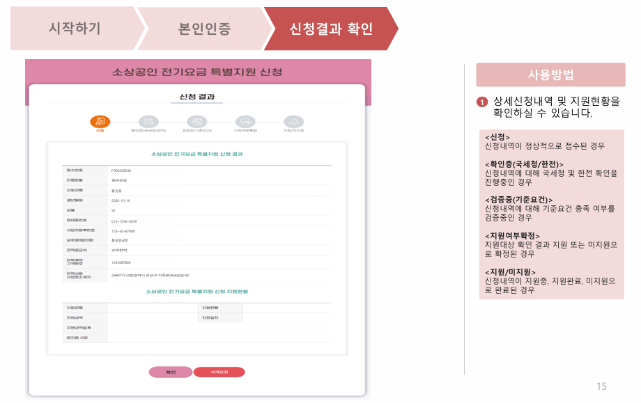 ▶ 신청 결과는 소상공인 전기요금 특별지원 초기화면에서 신청결과확인 버튼을 눌러 확인하실 수 있습니다.