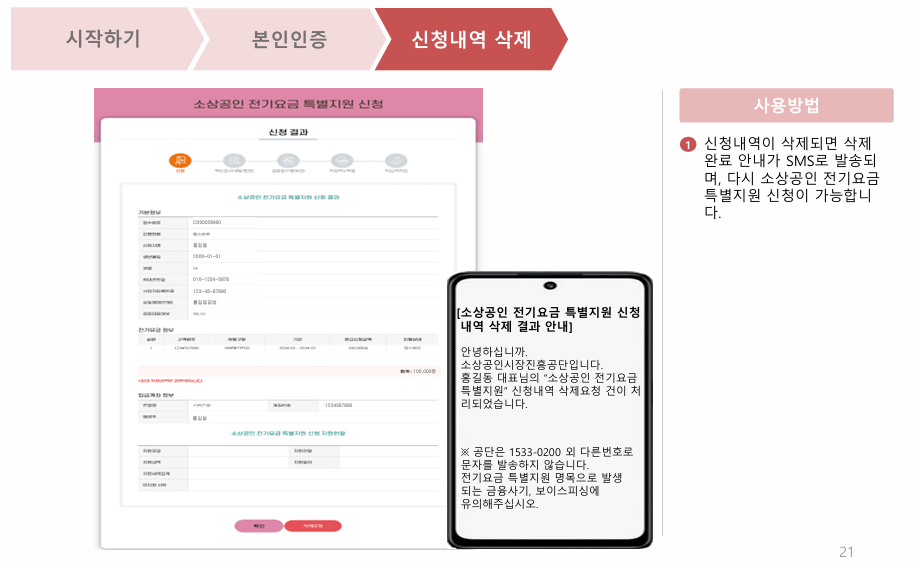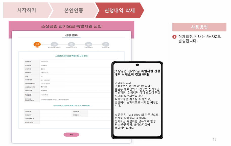 3. 신청내역이 삭제되면 삭제완료 안내가 SMS로 발송되면, 다시 소상공인 전기요금 특별지원 신청이 가능합니다.