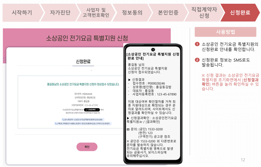 12. 소상공인 전기요금 특별지원의 신청완료 안내를 확인합니다.