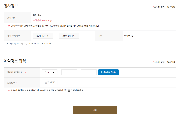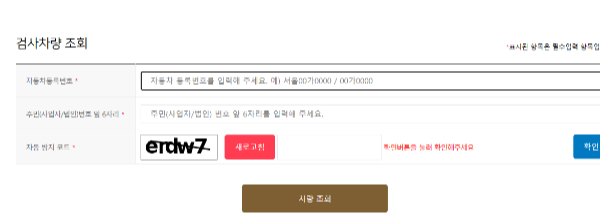 약관을 동의 후 차량번호와 소유자 주민등록 번호 앞자리를 입력한 후 차량조회 버튼을 클릭하면 검사정보, 예약정보 입력란에 기입후 다음을 클릭해 줍니다