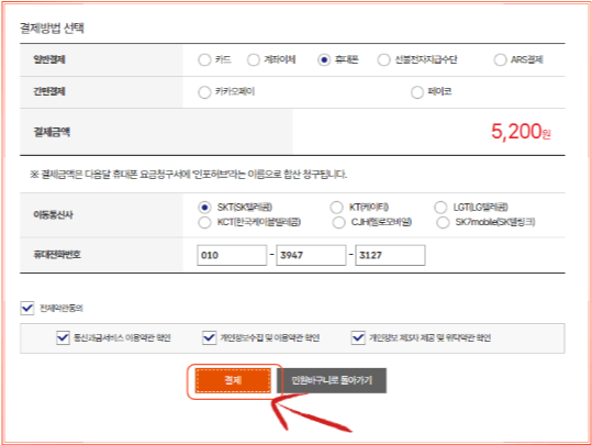 6. 주민등록증 재발급 수수료 5000원과 부과 수수료 200원 총 5200원 수수료 결제위해 방법을 선택 후 결제를 클릭합니다.