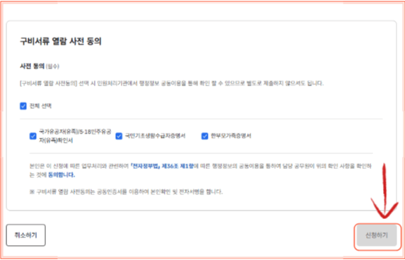 5. 구비서류 열람 사전 동의 확인(필수체크 되어있음) 후 신청하기 클릭합니다.