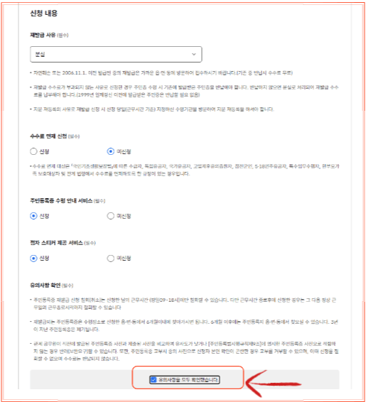5. 신청내용을 선택하고 아래 유의사항에 동의를 클릭합니다.