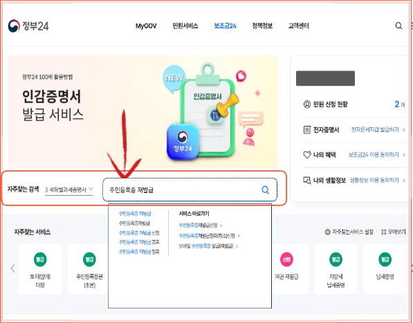 2. 메인화면 자주찾는 검색에 "주민등록 재발급"을 입력후 검색합니다.