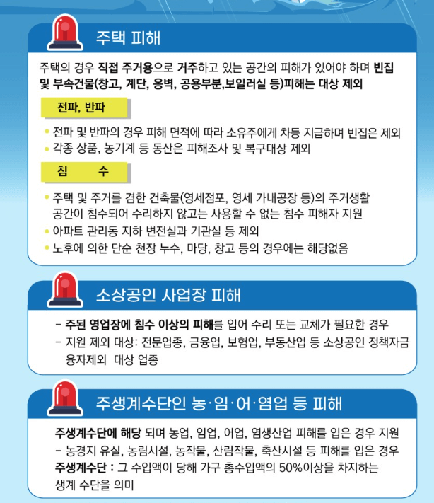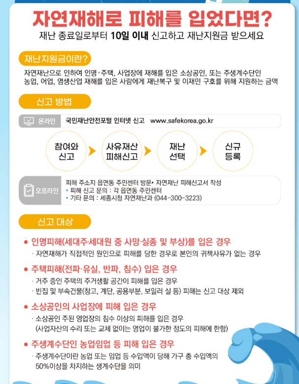 어제오늘 큰비로 많은 지역이 비 피해를 입었습니다. 마음을 추스를 여유도 없겠지만 예기치 못한 폭우나 자연재해로 인해 손해가 발생했다면, 재난 종료일로부터 10일 이내에 피해 사실을 신고하셔야 재난지원금을 받을 수 있으니 꼭 신고하셔서 도움받기를 바랍니다. 이번 글에서는 재난지원금에 대해, 피해 신고방법, 주요 신고대상자에 대해 자세히 알려드리겠습니다