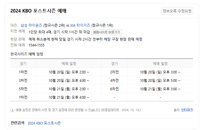 | 4차전 예매 | 10월 20일 일요일 17:00 |