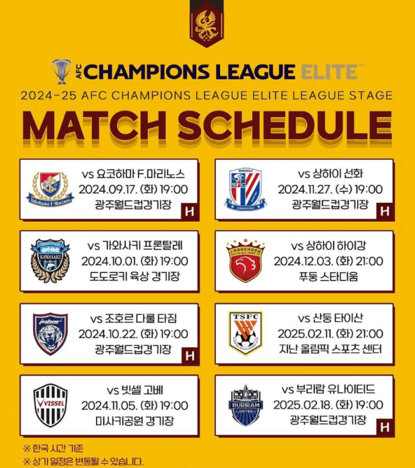 | 1차전 | 2024. 9.17 (화) 19:00 | vs 요코하마 F. 마리노스 | 광주월드컵경기장 | 홈 |
