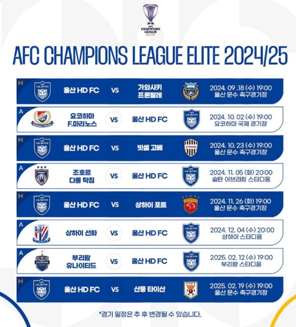 이번 2024~2025 AFC 챔피언스 리그 엘리트는 팀별로 총 8경기를 치릅니다. 홈경기 4경기, 어웨이 4경기를 치우게 됩니다. 다음은 K리그 3팀의 경기일정을 알려드리겠습니다