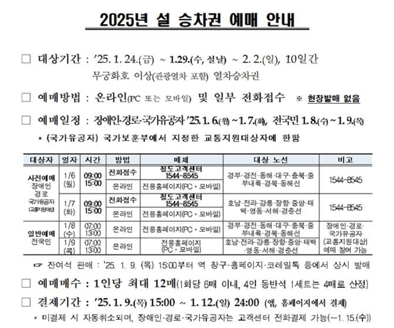 예매기간 : KTX : 2025년 1월 6일 (월) ~ 1.9 (목) 4일간