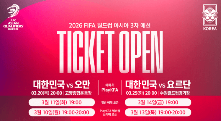2026년 월드컵 본선 진출을 위한 중요한 고비인 이번 오만전에서 대한민국 대표팀의 선전을 기원합니다. 오만전에서 승점을 추가해야 2위인 이라크와의 격차를 벌일 수 있고 월드컵 본선 진출에 유리하게 작용합니다. 축구 팬 여러분의 뜨거운 응원이 선수들에게 큰 힘이 될 것입니다. 경기 당일, 티켓 예매 및 중계 시청 방법을 미리 확인하시어 즐거운 관람 되시길 바랍니다.